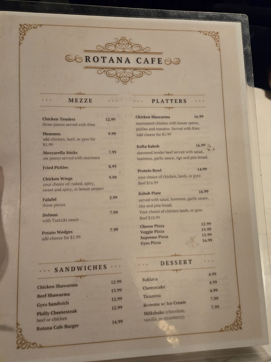 The menu is a treasure trove of enticing options, featuring mouthwatering sandwiches that cater to both meat-lovers and vegetarians alike. Indulge in the savory Chicken Shawerma or savor the crispy delights of the Falafel Sandwich—both priced at just $12.99 and bursting with flavor. If you’re leaning towards something heartier, try the iconic Philly Cheese Steak or the Rotana Burger, which is a steal at $9.99. And don’t overlook the appetizers! The Hummus ($7.99) served with freshly baked pita is a must-try, as is the addictively crispy French Fries ($6.99).